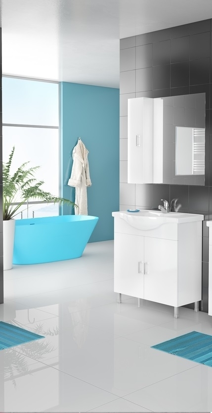 Alba möbelpaket från Nordamist med ett vitt golvstående tvättställskåp, tvättställ av porslin och en spegel.