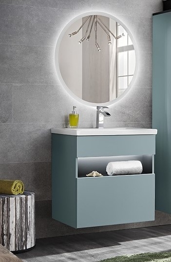 Möbelserien är akompanjerad av en rund spegel med LED-belysning som ger ett modernt intryck.
