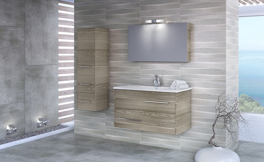 Fancy möbelpaket från Nordamist med ett vägghängt tvättställskåp i silvergrå, tvättställ av porslin och en spegel.