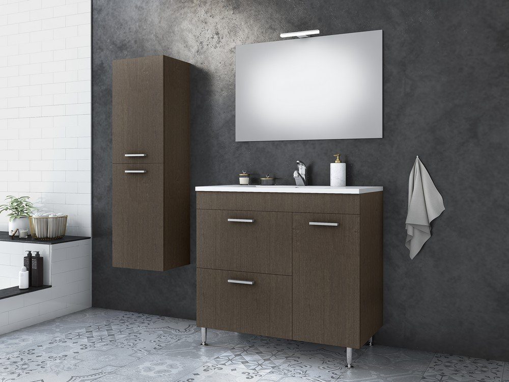 "Med" möbelpaket från Nordamist med ett mörkbrunt golvståede tvättställsskåp & integrerat porslinstvättställ, spegel, sidoskåp och belysningspaket.