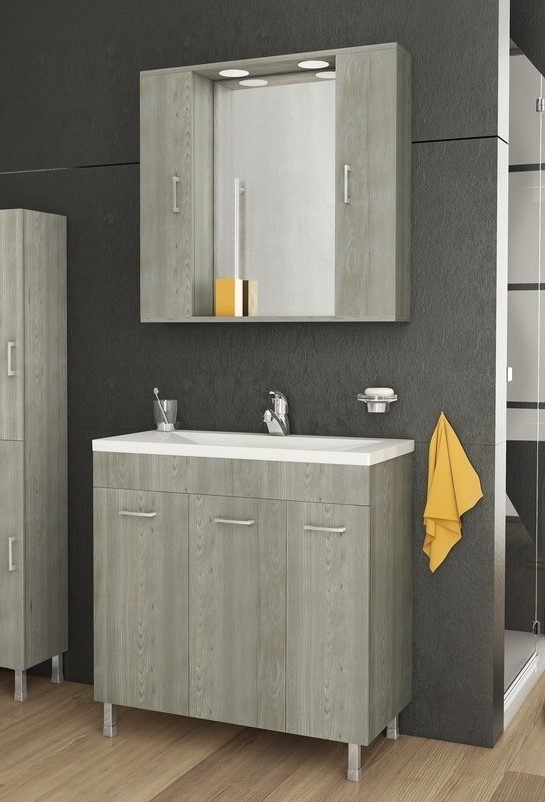Militos möbelpaket från Nordamist med ett golvstående tvättställsskåp i brun ek-finish, porslinsskiva & integrerat porslinstvättställ och ett spegelskåp. Sidoskåp ingår inte.