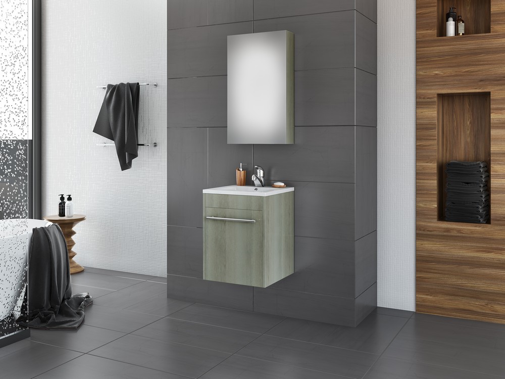 - Tvättställsskåp: Vägghängt tvättställsskåp (41 x 41 x 50 cm)