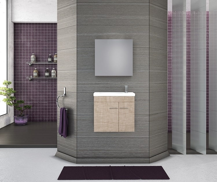 Thetis möbelpaket från Nordamist med ett vägghängt tvättställskåp i beige ekfinish, tvättställ av porslin och en spegel.
