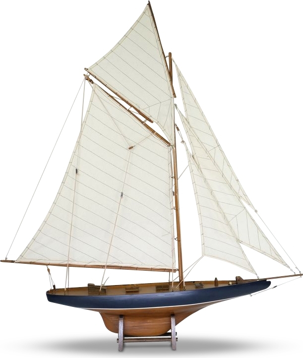 Modell av en klassisk segelbåt. Tillverkad av massiv furu, brunmålad med blå kant. Stora segel handgjorda av bomull.
