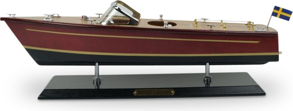 Modell av en klassisk motorbåt, tillverkad av massiv furu i mahogny utförande.