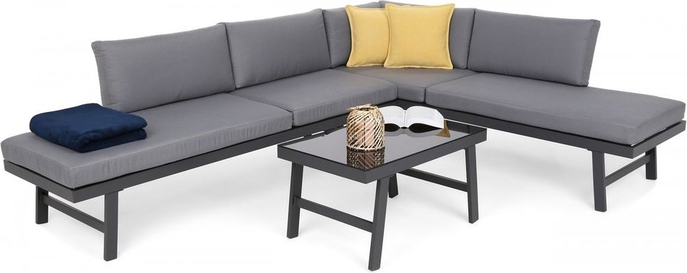 Modulsoffa Porto är en fiffig loungesoffa som kan användas på flera olika sätt. Du kan lätt förvandla hörnsoffan till en divansoffa, två separata soffor eller två solstolar med fällbara ryggar. Inkluderat är ett mindre avlastningsbord som passar utmärkt till de olika soffkombinationerna och dessutom matchar soffan väl i sin snygga gråa färg.
