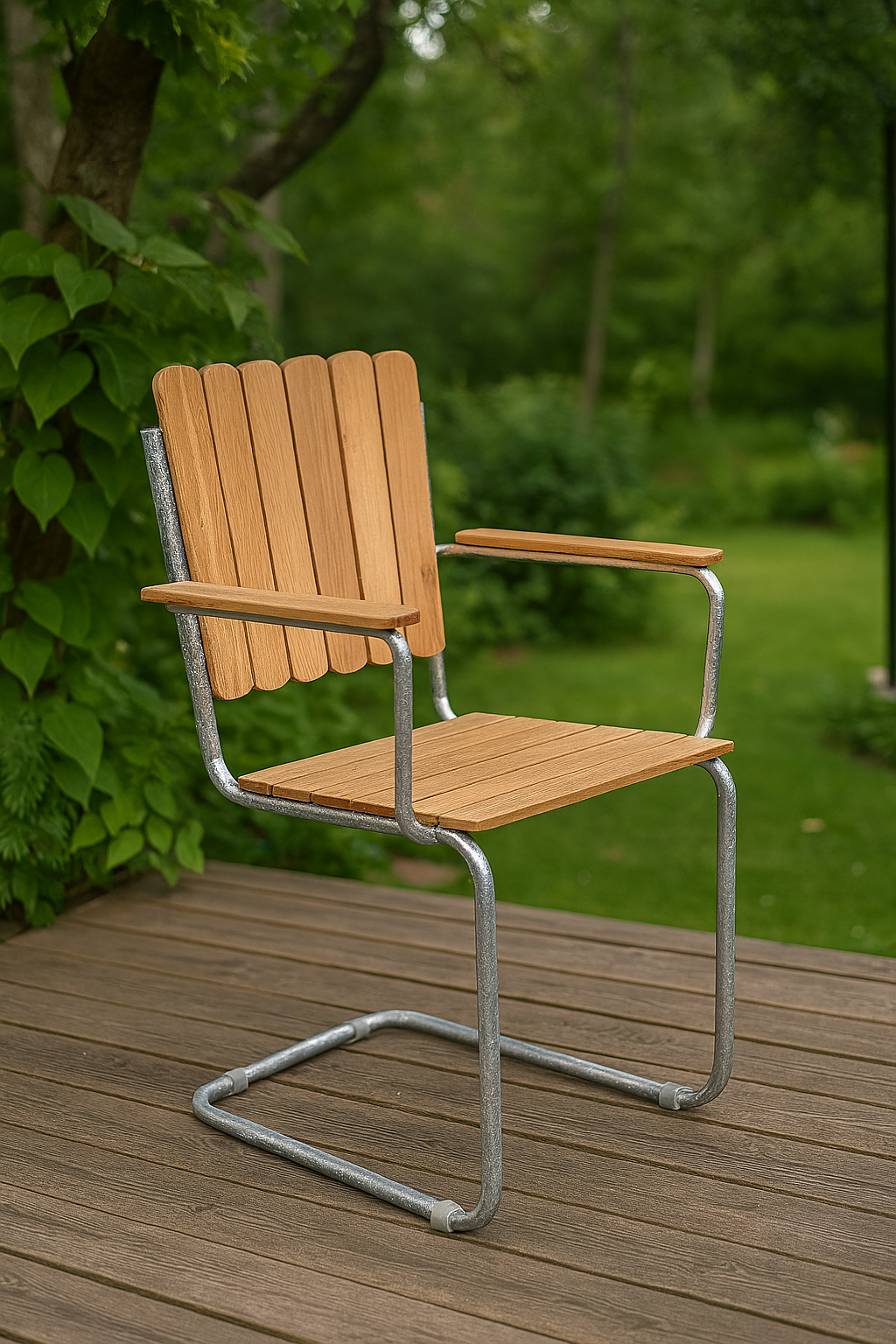 Möllan är en exklusiv serie i skandinavisk klassisk design. Utegruppen är tillverkad i galvaniserat stål med massivt oljat teakträ. Detta gör utegruppen väderbeständig och tålig för att klara uteplatsens miljö.