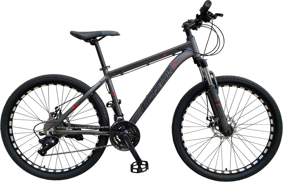 Sportig cykel anpassad för on och off-road. Sportig mountainbike med stötdämpad framgaffel så du kan ge dig an både terräng och vägar. Utrustad med skivbroms både fram och på bakhjulet för stark och anpassad nerbromsning. Cyklen har också hela 27 olika växlar så att man kan anpassa sin cykelfärd för olika situationer och distanser.