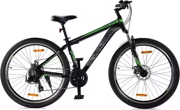 Sportig mountainbike med stötdämpad framgaffel, terrängmönstrade däck på 27,5" som hjälper föraren på grova underlag. För din säkerhet är den fullt utrustad med skivbroms både fram och på bakhjulet för stark och anpassad nerbromsning, reflexer på hjul och ram. Cyklen har också hela 21 olika växlar så att man kan anpassa sin cykelfärd för olika situationer och distanser.