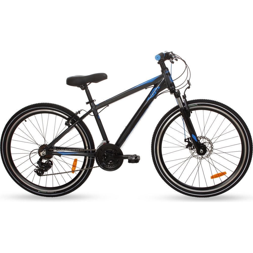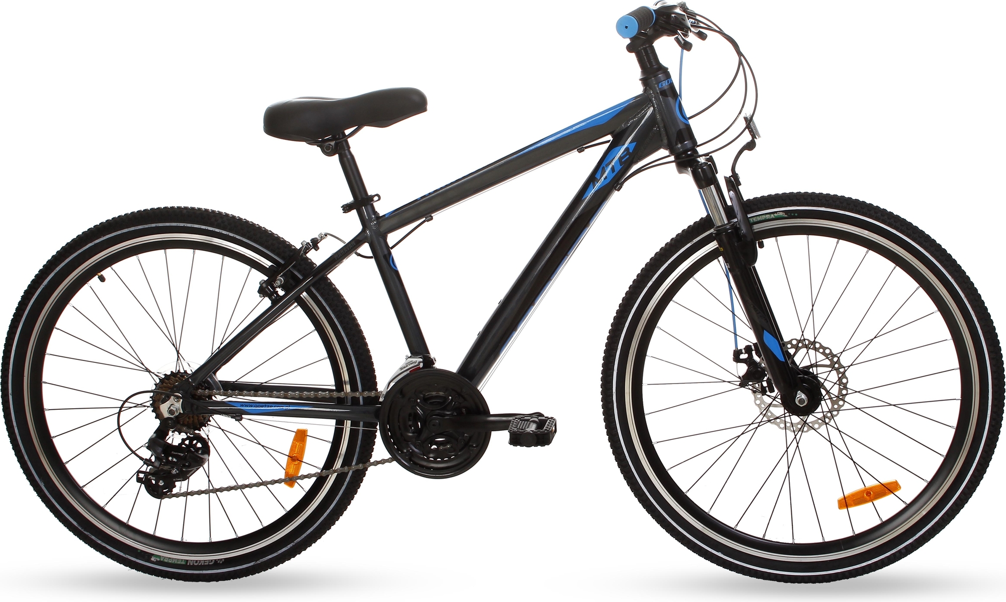 Sportig mountainbike terrängcykel med treväxlat vev och 21 totala växlar som ger kontroll och en bekväm pedalhastighet oavsätt terräng. Vikten är relativt låg på 14,5 kg eftersom ramen är gjord i aluminium. Cykeln är också utrustad med Shimano Turney-derailleur som guidar kjedjan mellan växlarna och skyddar mot kjedjehopp.