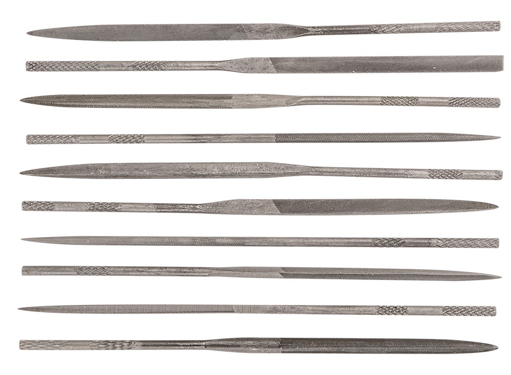 10 stycken 140 mm långa nålfilar i olika former, utan handtag. Främst för precisionsfilning av metall.