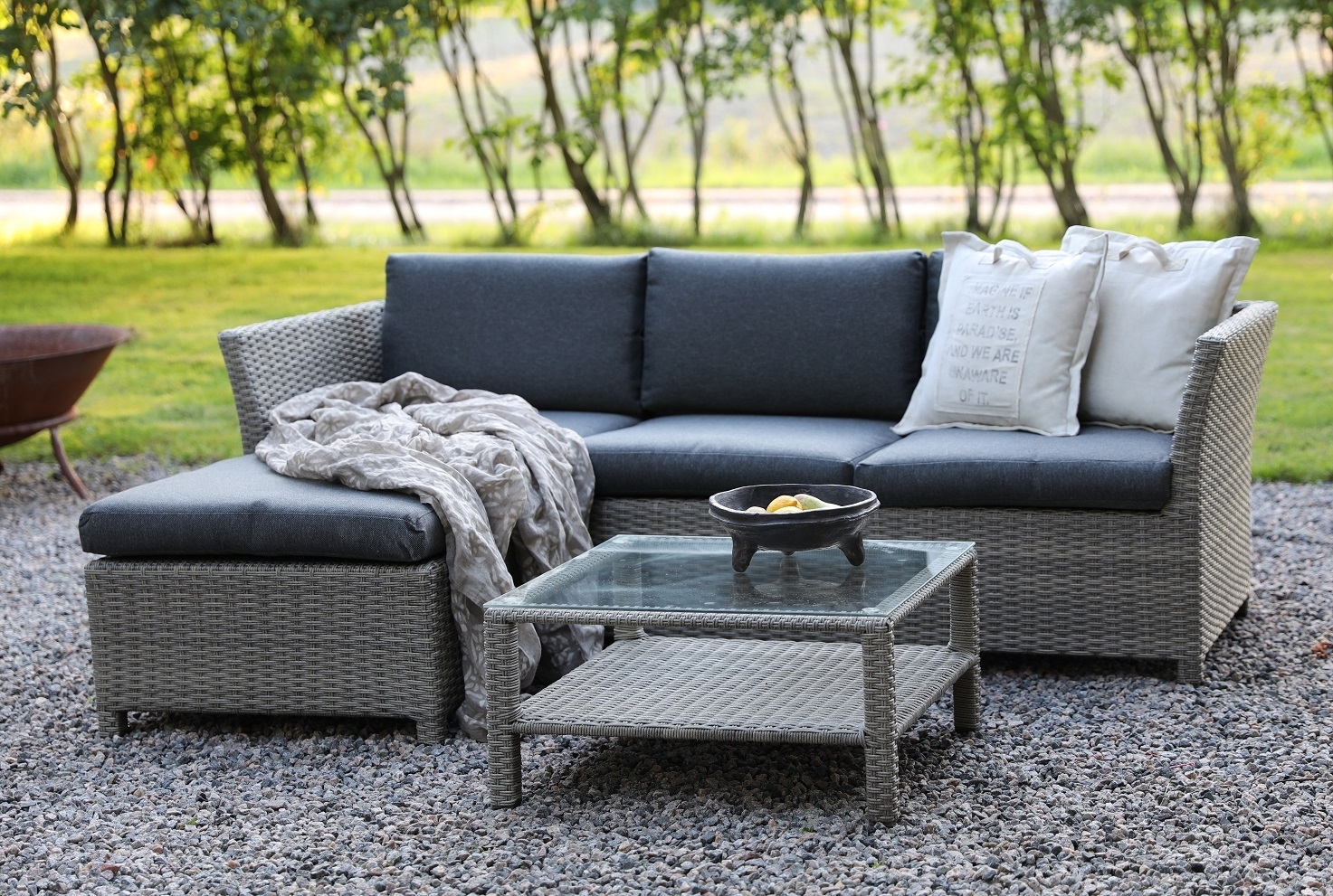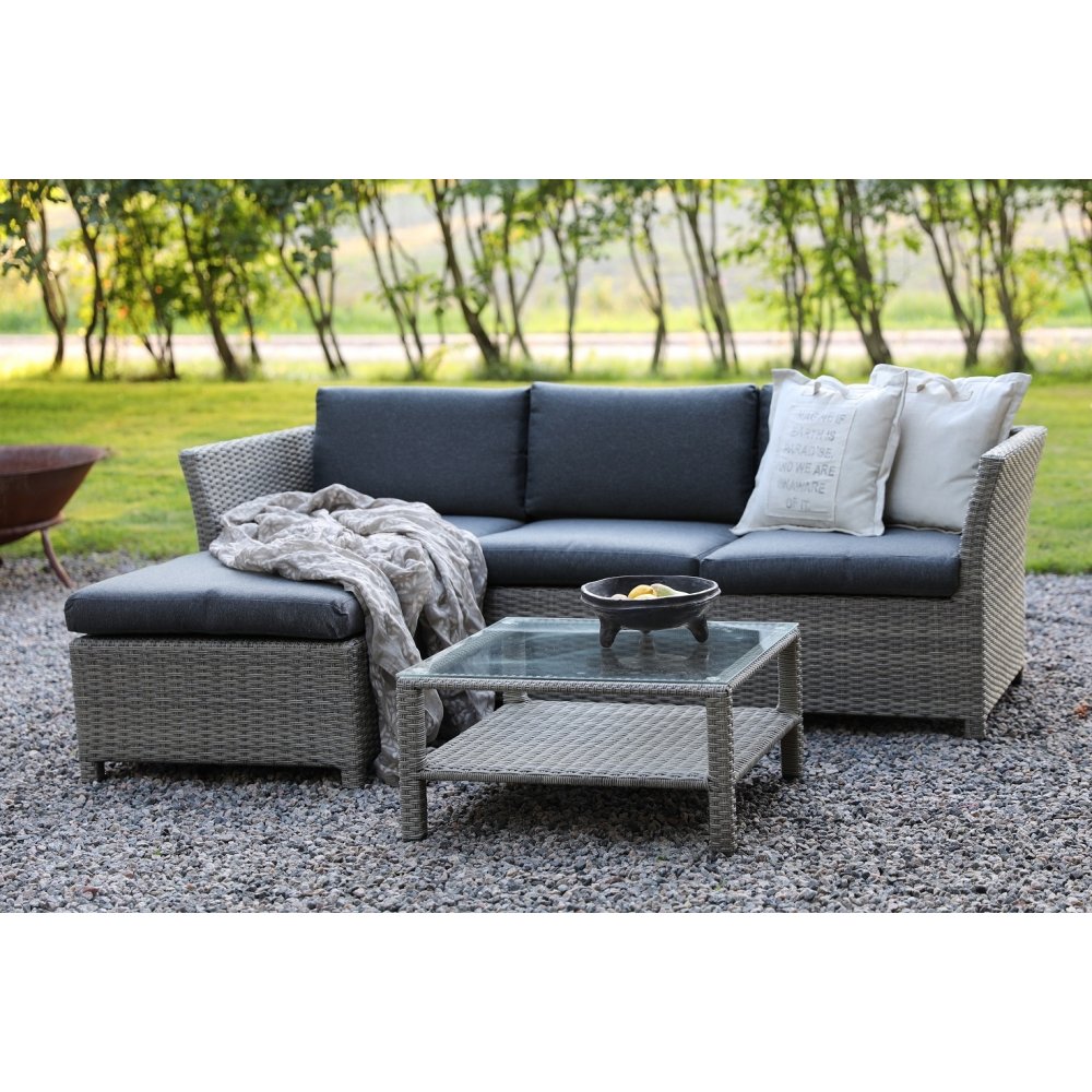Utemöbelgrupp bestående av 3-sits soffa, flyttbar pall (som även kan fungera som divan) och ett bord. Gruppen är tillverkad av grå konstrotting, dynor av grått polyestertyg. Även bordet är av matchande konstrotting med underhylla och toppskiva av härdat glas.