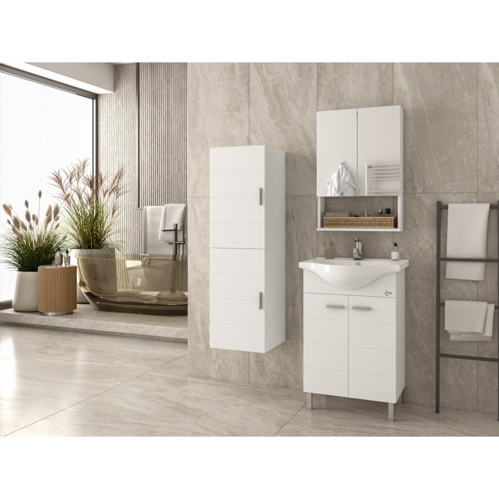 Tvättställsskåpet är tillverkat i tålig MDF och har två luckor med fint spårfrästa linjer som ger skåpet mer karaktär. Som pricken över iet har de fina knoppar i silver som matchar benen. Här har du bra förvaring till badrummets förnödenheter.