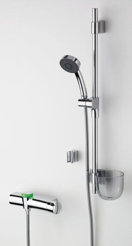 Termostatblandare 150cc som reagerar snabbt och exakt på temperaturvariationer i tappvattensystemet och bibehåller den temperatur som valts. Temperaturratten är försedd med en skållningsspärr (ca 38°C) som kan överskridas med en knapptryckning. Oras Eterna’s EcoLed-tryckknapp indikerar med ljussignaler den idealiska längden för en dusch ur ett vatten- och energispar perspektiv.Blandaren startas genom att trycka på EcoLed-knappen som ger en grön ljussignal. Om blandaren stängs av inom 2 minuter får du en ny grön ljussignal som bekräftelse på att du tagit en ekologisk dusch. Om du duschar längre än 2 minuter så får du en röd ljussignal. Efter 3 minuter så börjar EcoLed-knappen att blinka kontinuerligt med rött ljus och efter 4 minuter stängs blandaren av automatiskt. Blandaren kan naturligtvis startas igen genom att trycka på EcoLed-knappen. Ljussignalerna kan med enkelt handgrepp stängas av. Blandaren levereras med smutsfilter och backventiler. EcoLed funktionen drivs av 2 x 1.5 V Litium batterier.Oras Natura duschset: Eco-knapp i handduschen som möjliggör upp till 50 % vatten- och energibesparing. Duschsetet inkluderar: Duschstång med flexibla väggfästen, handdusch med Eco-knapp, vägghållare för handdusch, duschslang, tvålkopp samt en praktisk krok.40cc installation: Blandaren kan kombineras med Oras blandarfäste 40/150cc för utanpåliggande rördragning, Oras nr. 204150, RSK nr. 8187216Design Kirsi Svärd