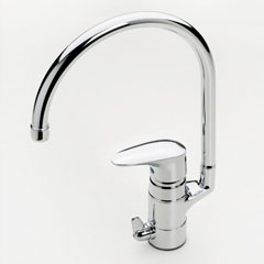 Oras Vega köksblandare med hög pip och diskmaskinsavstängning och flexibla anslutningar. Svängbar pip spärrad 120°, bekväm två-komponents spak med eco-knapp för begränsning av flöde. Ökat flöde fås genom att trycka in eco-knappen samtidigt som spaken lyfts förbi spärrläget.