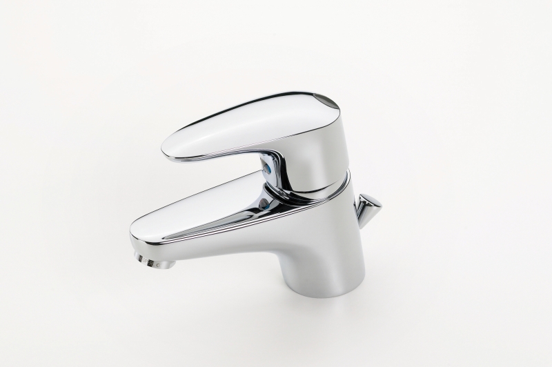 Oras Vega tvättställsblandare med lyftventil Bekväm två-komponents spak med eco-knapp för begränsning av temperatur och flöde. Högre temperatur och ökat flöde fås genom att trycka in eco-knappen samtidigt som spaken lyfts eller vrids förbi spärrläget.