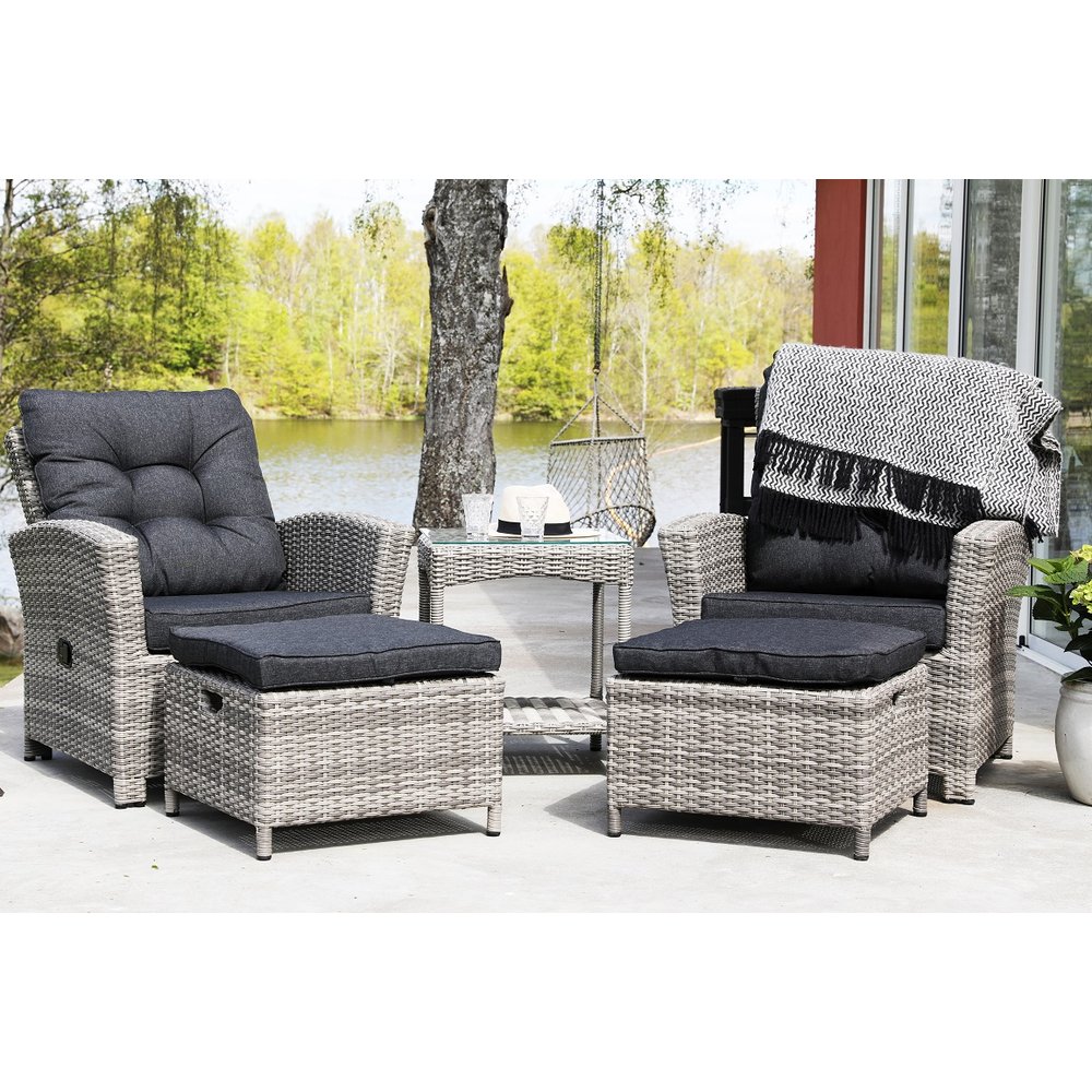 Fåtöljset Orlando med två fällbara fåtöljer, tillhörande fotpallar samt ett nätt bord, allt i matchande gråcementfärgad konstrotting. Passar bra för avkoppling ute på uteplatsen, terrassen etc. Inklusive mörkgråa dynor. Högsta kvalitet på den dubbelflätad halvrunda rottingen!