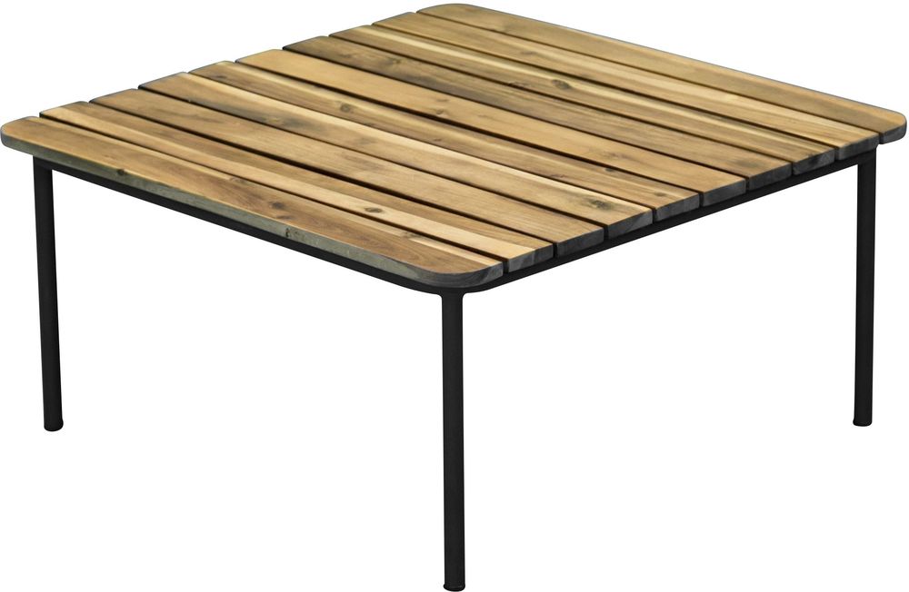 Soffbord med svart metallunderrede och toppskiva av akacia.