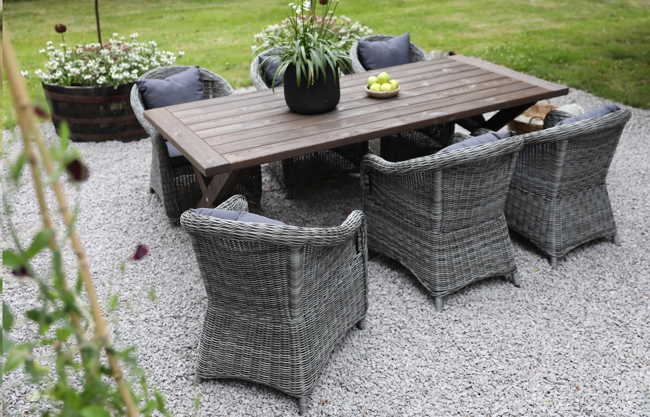 De trädgårdsstolar som medföljer i denna utemöbelgrupp är Mercury och är tillverkade grå konstrottning och de dynor som tillhör trädgårdsstolarna är tillverkade i en mörkgrå polyester.