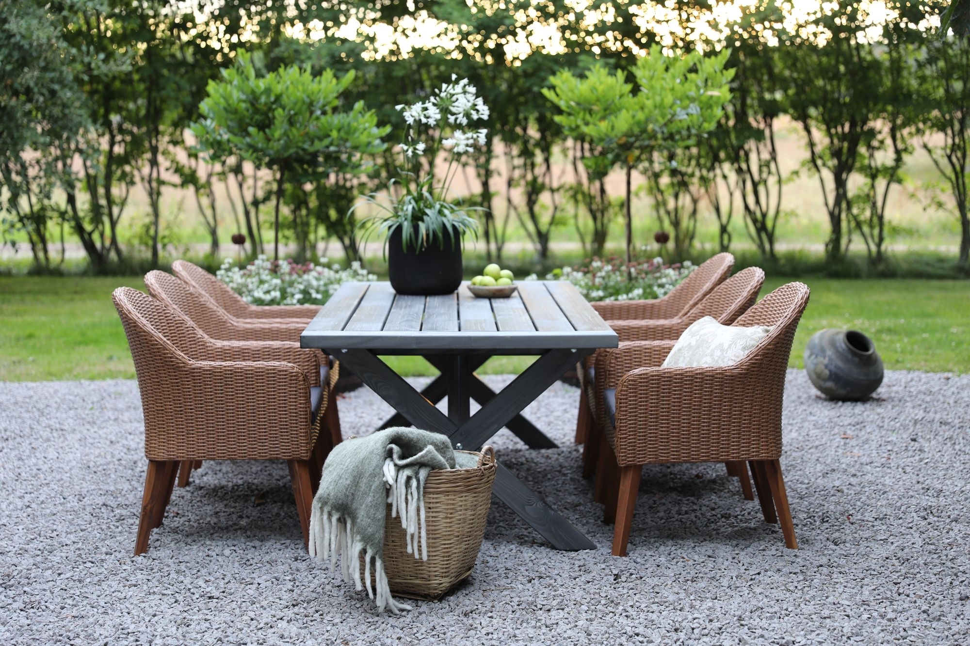De trädgårdsstolar som medföljer i denna utemöbelgrupp är Valetta och har en fin naturfärgad konstrottning med bruna ben och en mörkgrå sittdyna. I den här utemöbelgruppen medföljer 6 stycken stolar.
