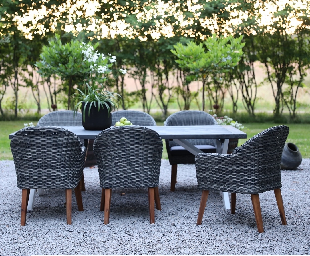 De trädgårdsstolar som medföljer i denna utemöbelgrupp är Valetta och har en jordnära grå konstrottning med bruna ben samt en mörkgrå sittdyna. I den här utemöbelgruppen medföljer 6 stycken stolar.