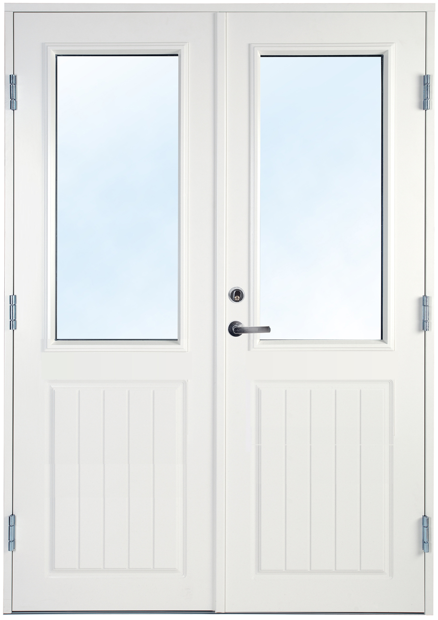 Dörrarna är dekorerade nedtill på både in- och utsida. Fönstrena är en 2-glas isolerrutor med Argon vilket ger ett lågt U-värde.