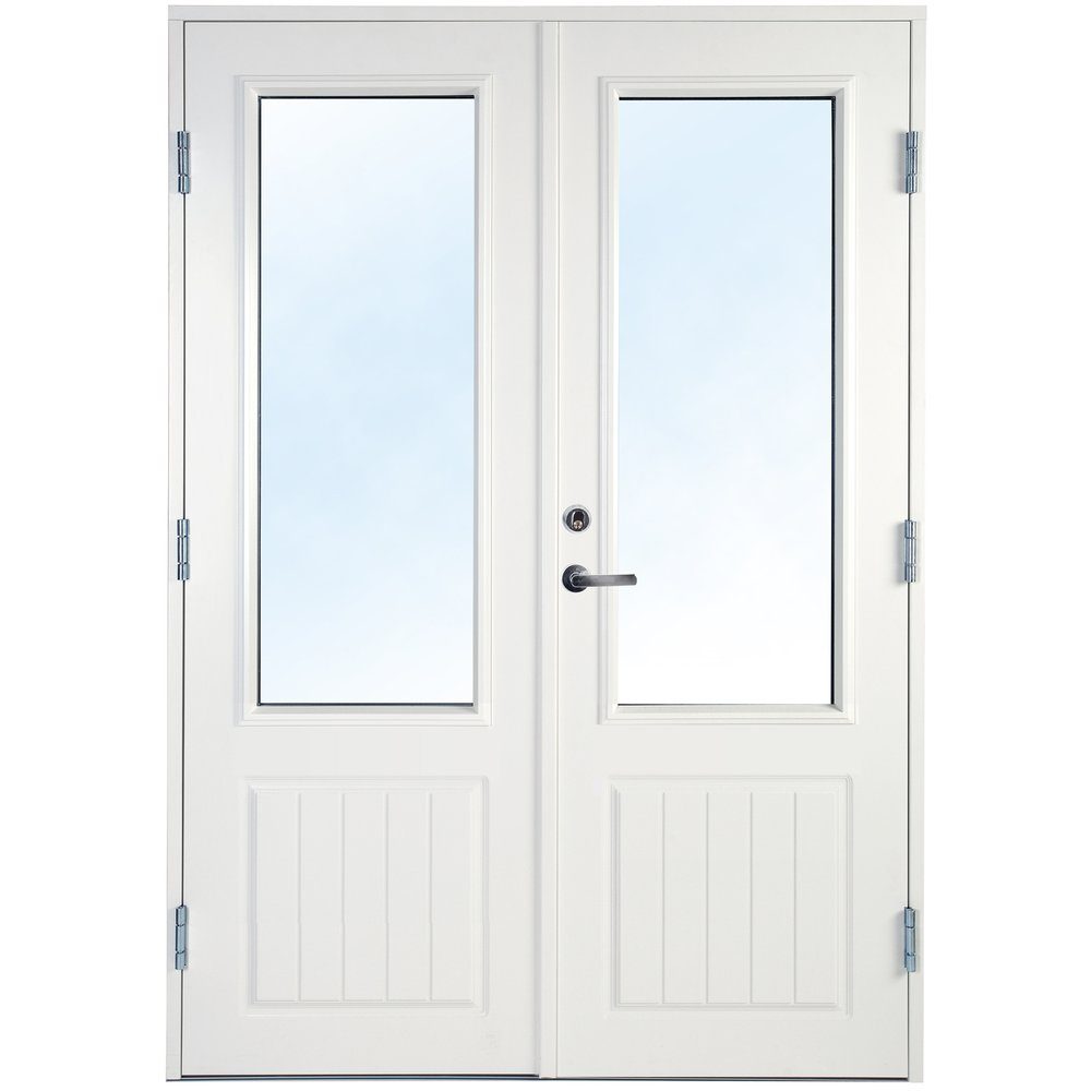 Dörrarna är dekorerade nedtill på både in- och utsida. Fönstrena är en 2-glas isolerrutor med Argon vilket ger ett lågt U-värde.