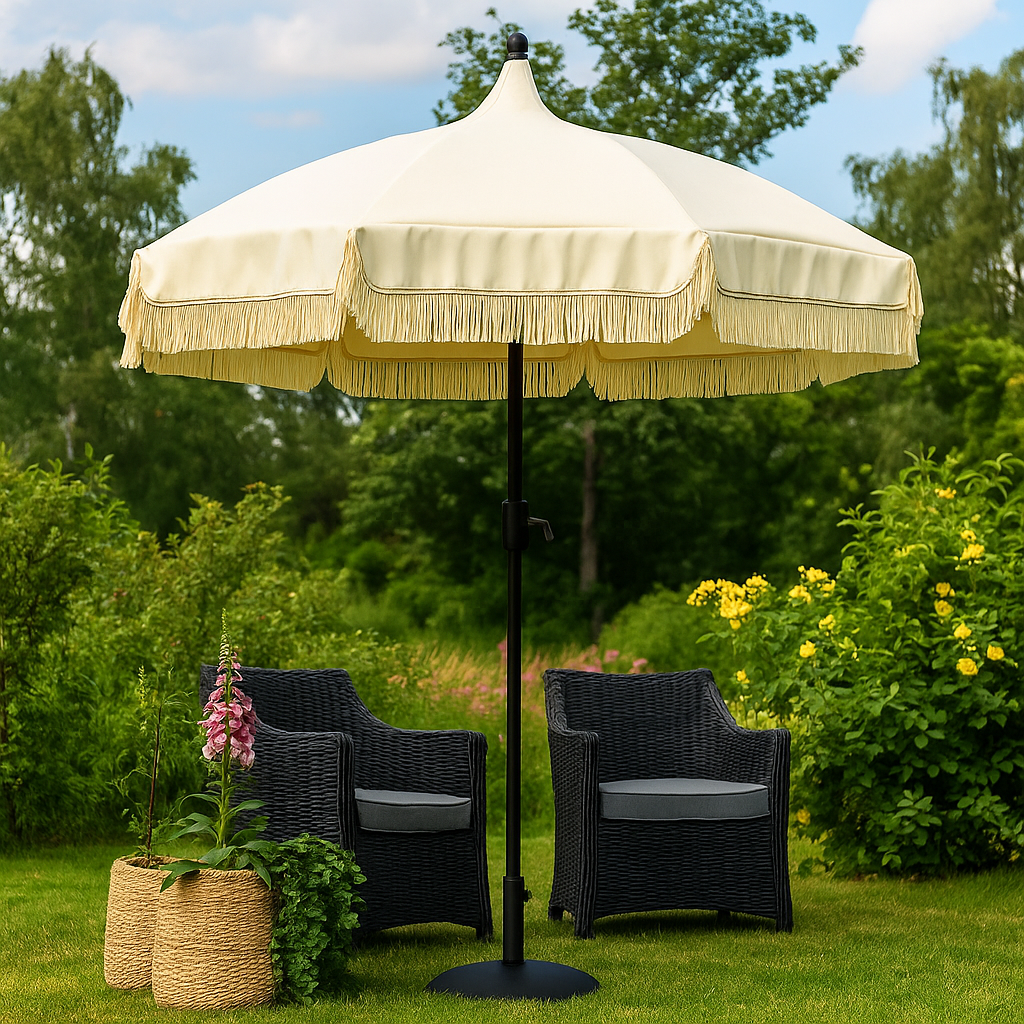 Cirkus parasoll är en tidlös modell som kombinerar funktion med dekorativ design. Med sin ljusa parasollduk och dekorativa tofsar längs kanterna skapas en mysig och inbjudande känsla på uteplatsen. Den träliknande stången i mörk ton ger ett elegant uttryck som passar både klassiska och moderna miljöer.
