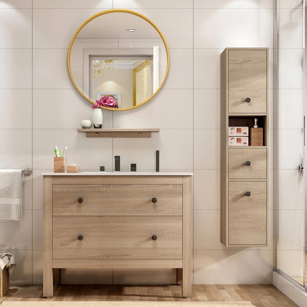 Paris är ett badrumspaket med ljus skandinavisk design i träimitation med hela fem delar, kommod, tvättställ, spegel, hylla och sidoskåp.