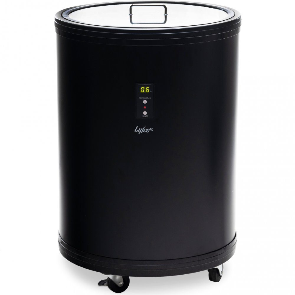 Coolern har en stilren svart finish och ett genomskinligt lock i glas med handtag, vilket gör det enkelt att se innehållet utan att öppna.