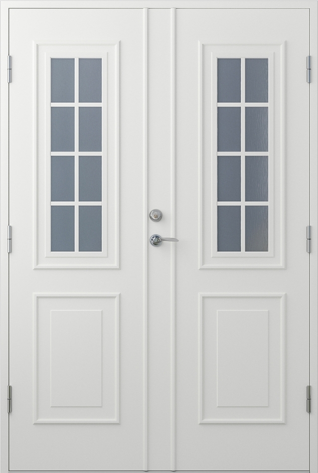 Parytterdörr med glas i serien Nathalie. Denna dörr har asymmetriska dörrblad - det vill säga det aktiva dörrbladet är bredare än det passiva. Dörren kan anpassas precis efter dina behov vad det gäller mått, färg, glastyp, öppningshåll och mycket mer.
