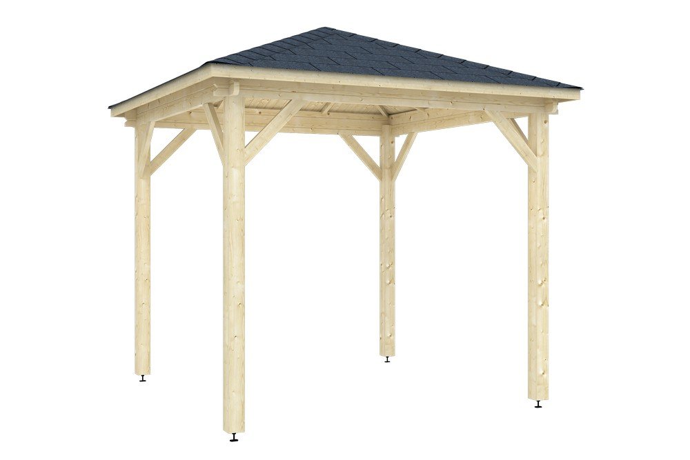Paviljong Elias passar bra när man vill slå sig ner i lugn och ro utomhus och samtidigt ha lite skydd från sol och regn. Material av nordisk gran av hög kvalite, utvalt med omsorg. Paviljongen levereras obehandlad som en byggsats och monteras enkelt ihop efter medföljande ritning.