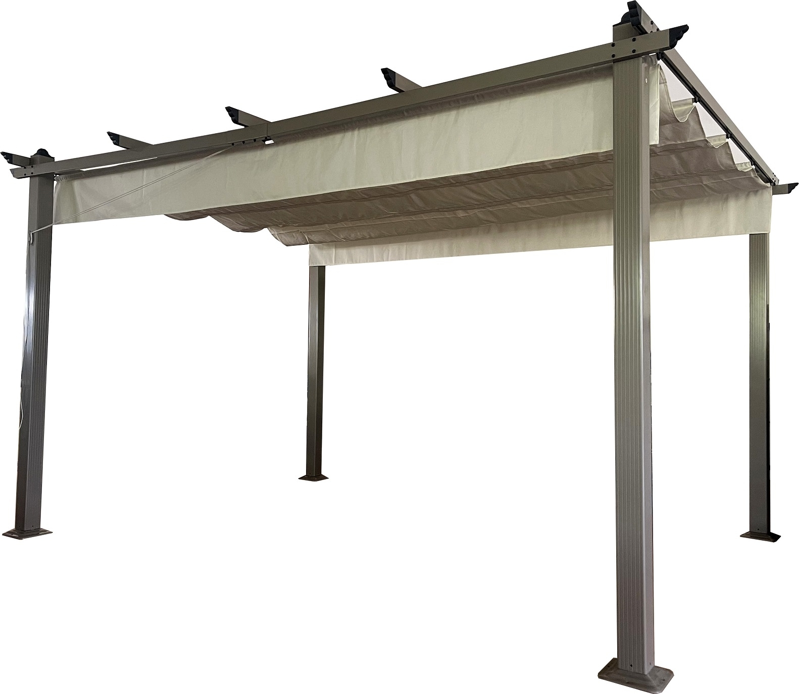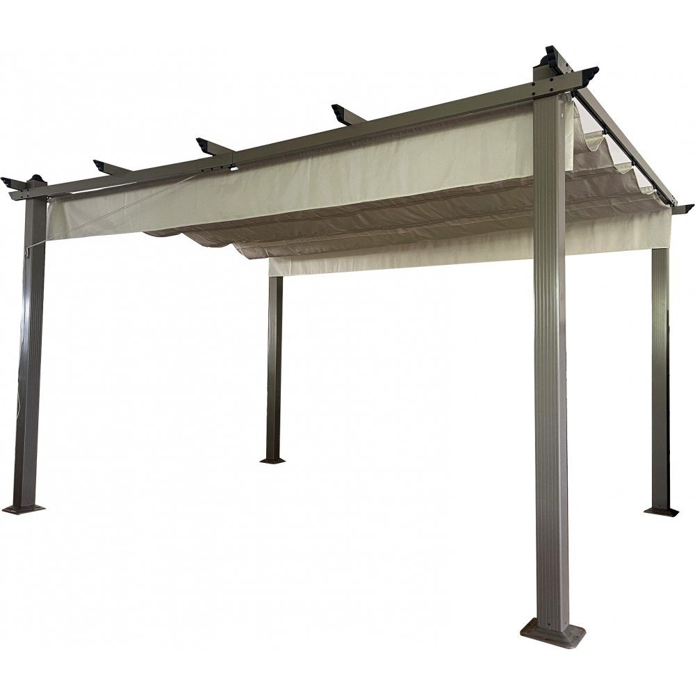 Pergola med stomme tillverkad i aluminium och solskydd i polyester med PU-beläggning.