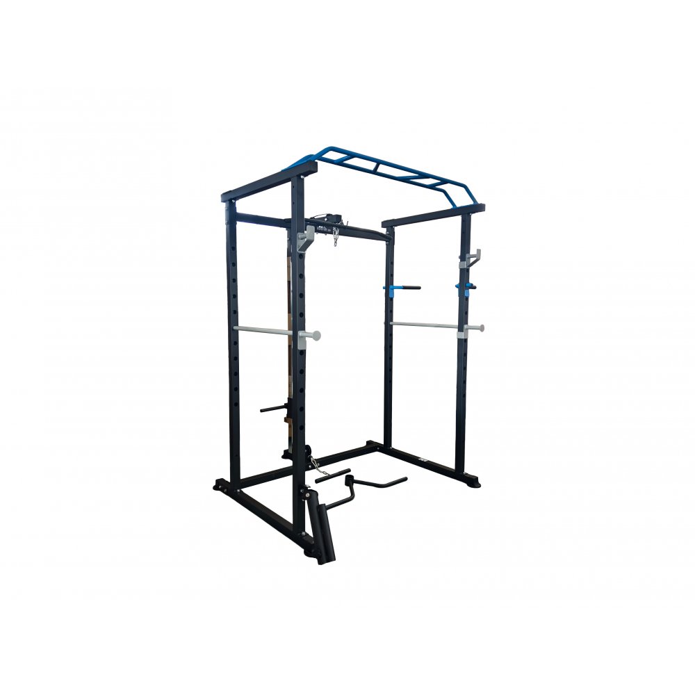 Den robusta stålramen ger en trygg och säker träningsmiljö, även vid tyngre belastning. Power racket är utrustat med justerbara säkerhetsstöd och krokar för skivstång, vilket gör det enkelt att anpassa höjden efter olika övningar och användare. På ovansidan finns en integrerad pull-up-stång med flera greppalternativ som ger möjlighet till effektiv träning av rygg, armar och bål.