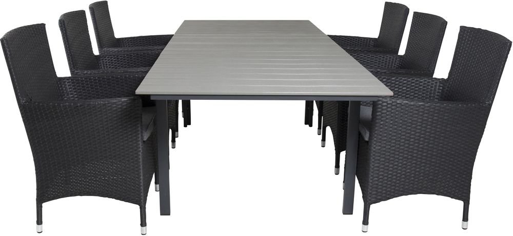 Matgrupp med ett bord och 6 stycken stolar. Stolarna är tillverkade av Konstrotting/Aluminium och bordet är tillverkat av Aintwood/Aluminium. Dynor ingår.
