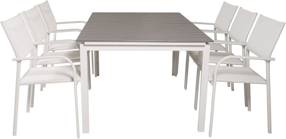 Matgrupp med ett bord och 6 stycken stolar. Stolarna är tillverkade av Aluminium/Textilene och bordet är tillverkat av Aintwood/Aluminium. Stolarna är stapelbara.