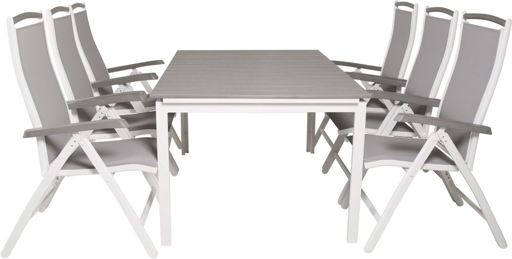 Matgrupp med ett bord och 6 stycken stolar. Stolarna är tillverkade av Aluminium/Aintwood/Textilene och bordet är tillverkat av Aintwood/Aluminium.