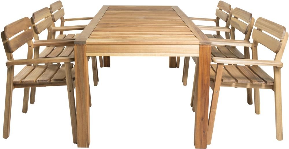 Matgrupp med ett bord och 6 stycken stolar. Stolarna är tillverkade av Akacia och bordet är tillverkat av Akacia. Stolarna är stapelbara.