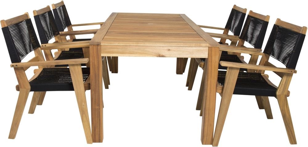 Matgrupp med ett bord och 6 stycken stolar. Stolarna är tillverkade av Akacia/Rep och bordet är tillverkat av Akacia.