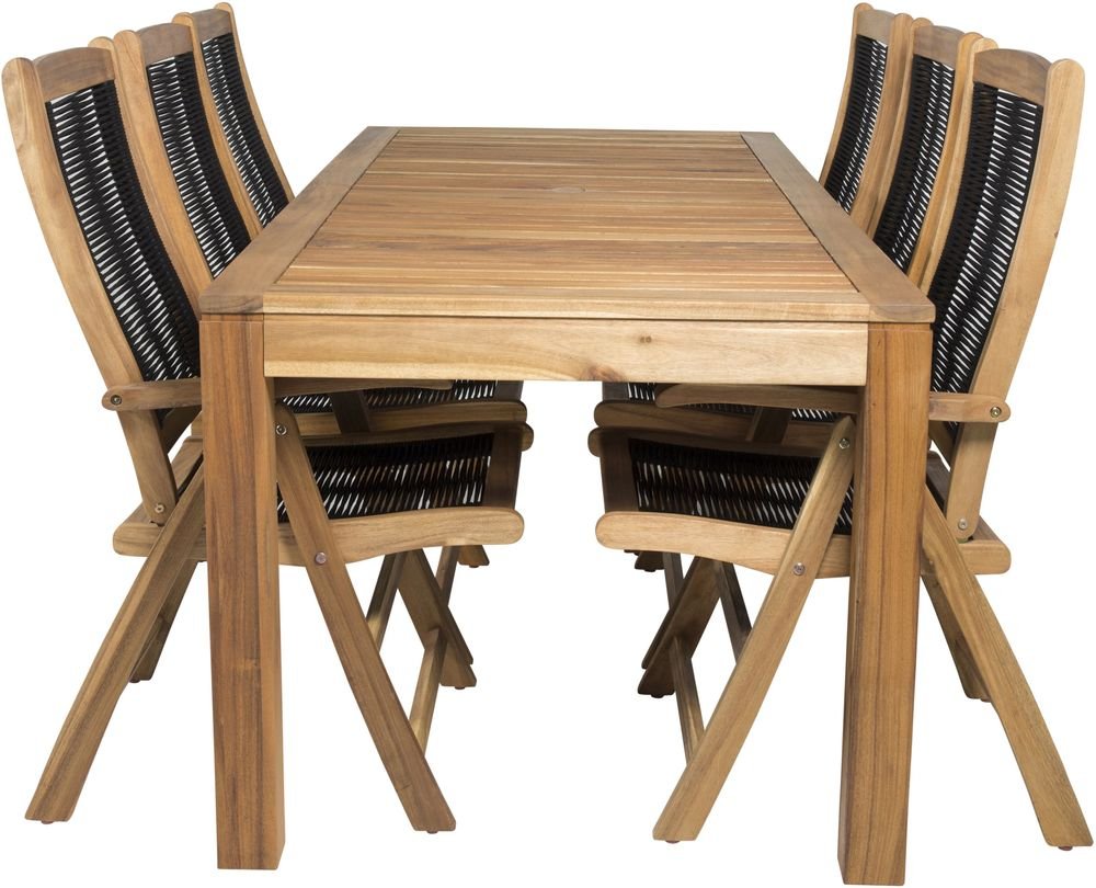 Matgrupp med ett bord och 6 stycken stolar. Stolarna är tillverkade av Akacia/Rep och bordet är tillverkat av Akacia.