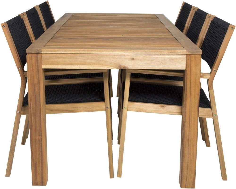 Matgrupp Prässebo har 6 stycken fina stolar inkluderat och ett robust träbord i Akacia. Ett set som andas både modern design och design från förr. Stolarna har en snygg kombination av akaciaträ och flätad svart tråd som ger möblemanget karaktär och en gedigen känsla. Matbordet har en fin inramning längst med kanterna och rejäla fyrkantiga ben. Denna snygga utegrupp har 6 stycken stolar och ett stort bord på 200 cm där långa middagar kan avnjutas tillsammans.
