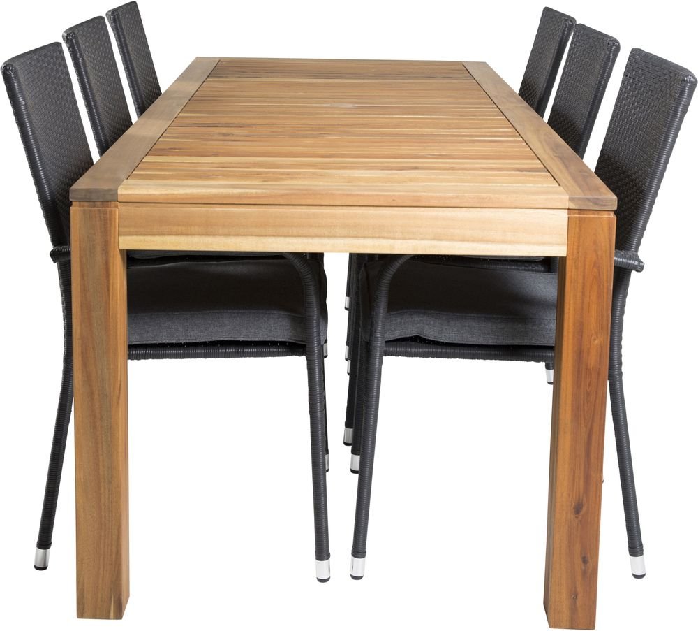 Matgrupp med ett bord och 6 stycken stolar. Stolarna är tillverkade av Konstrotting/polyester och bordet är tillverkat av Akacia. Dynor ingår.