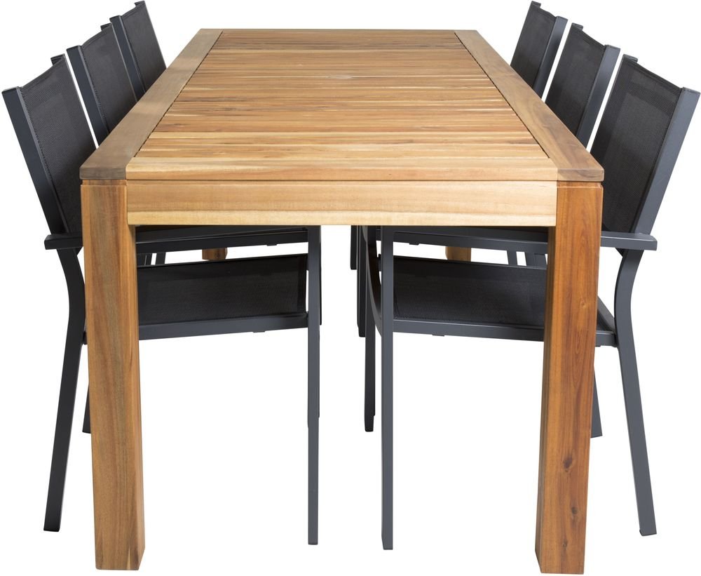 Matgrupp med ett bord och 6 stycken stolar. Stolarna är tillverkade av Aluminium/Textilene och bordet är tillverkat av Akacia. Stolarna är stapelbara.