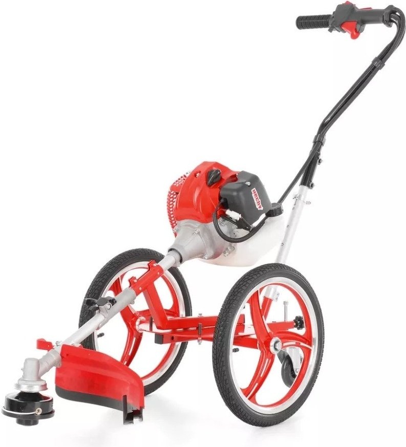 Bensindriven grästrimmer med trimmerhuvud (trimmertråd ingår). Drift, 2-takts 52 cc bensin motor. Tack vare hjulen avlastar du ryggen och kan klippar längre stunder.