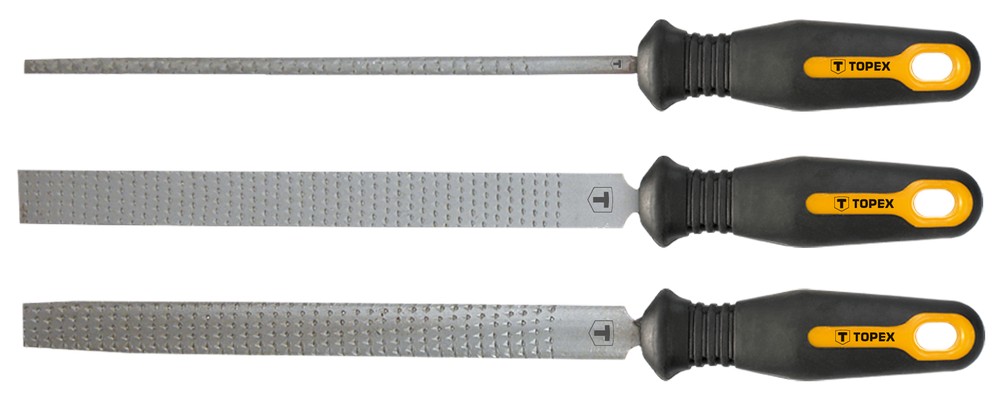 3 stycken 200 mm långa träraspar. Ergonomiskt handtag klätt i antihalkmaterial.