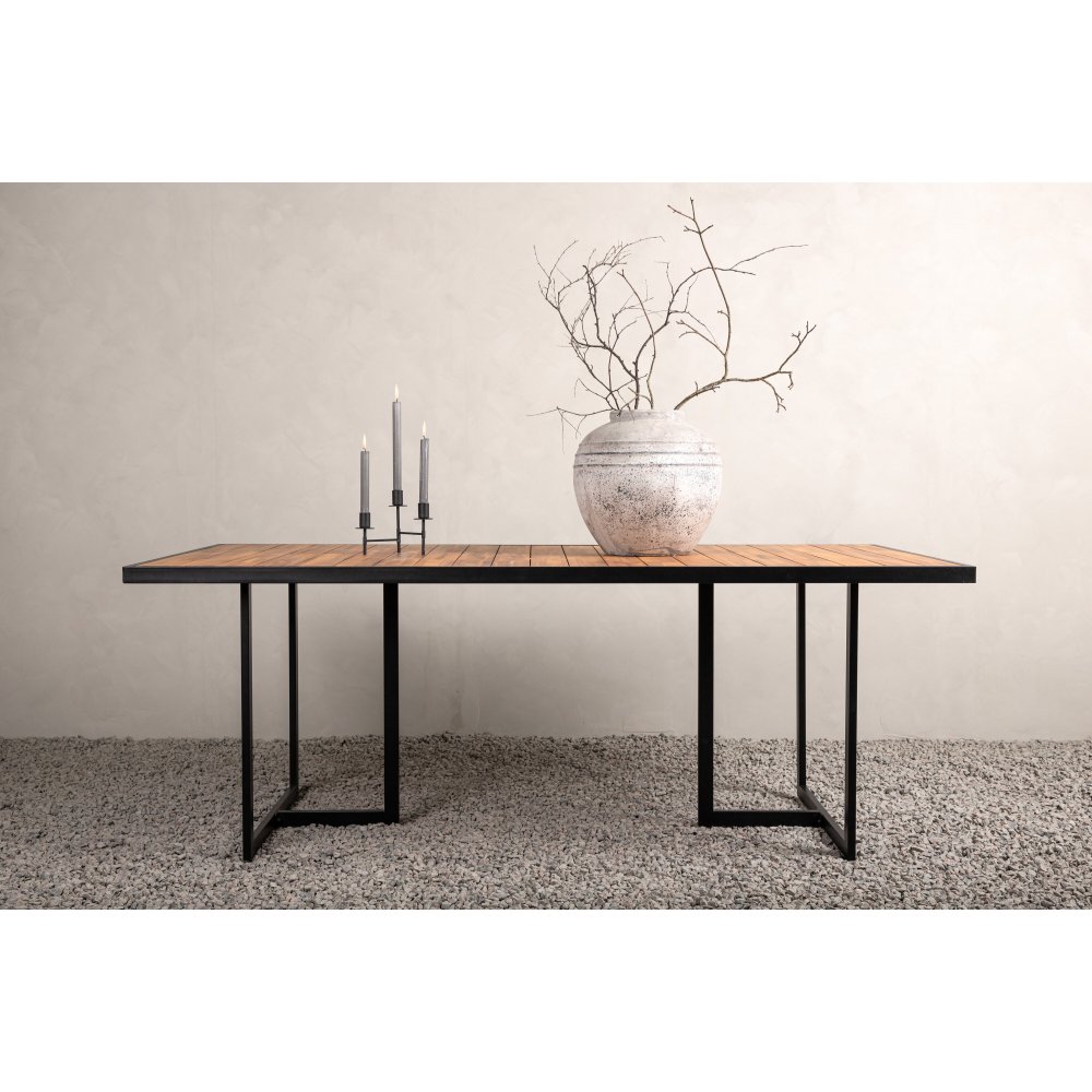 Matbord är ett stilfullt och robust bord i brun akacia, med en dekorativ ram och ett stabilt underrede i svart stål. Kombinationen av naturligt trä och industriella detaljer ger ett modernt och inbjudande uttryck som passar lika bra i trädgården som på uteplatsen. Här kan du samla familj och vänner och njuta av sommarens alla härliga stunder.