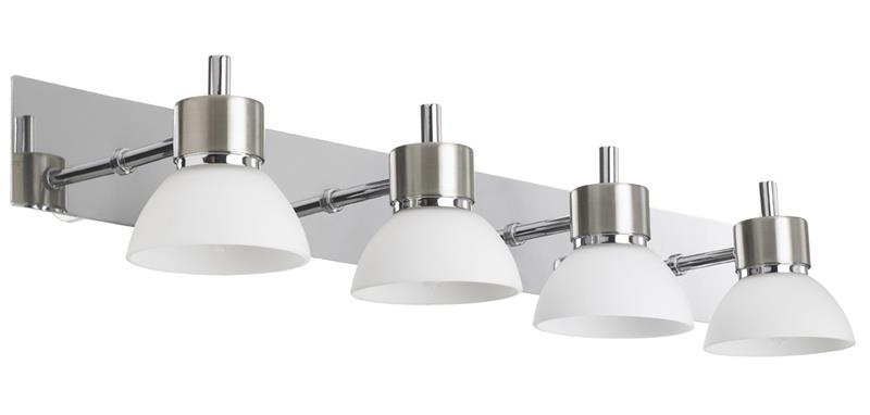 Stilren vägglampa, anpassad för badrummet. Lampan är tillverkad i metall med detaljer i krom och vita glasskärmar. Fast installation (Klass 1). G9 sockel för effekt på max 40W. Lampan monteras lätt på plats i badrummet.
