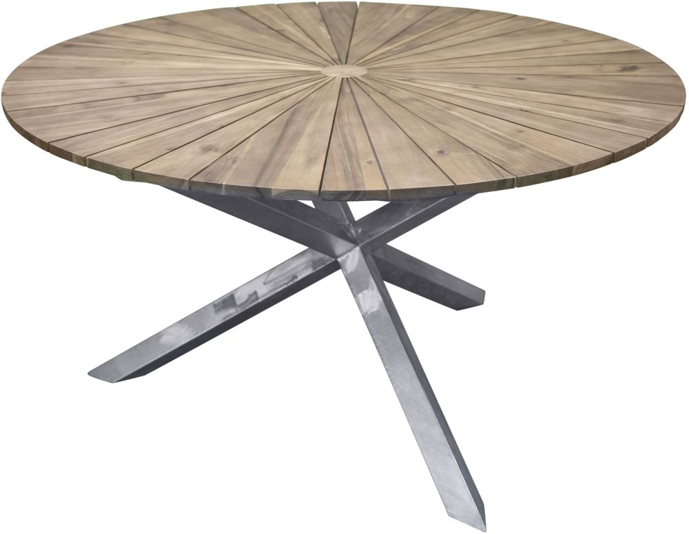 Runt matbord med bordsskiva av akacia och underrede av metall.