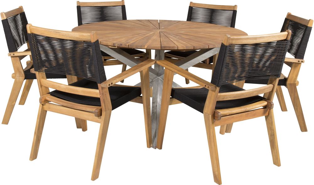 Matgrupp med ett bord och 6 stycken stolar. Stolarna är tillverkade av Akacia/Rep och bordet är tillverkat av Akacia/Stål.