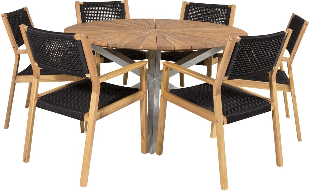 Matgrupp med ett bord och 6 stycken stolar. Stolarna är tillverkade av Akacia/Rep och bordet är tillverkat av Akacia/Stål.
